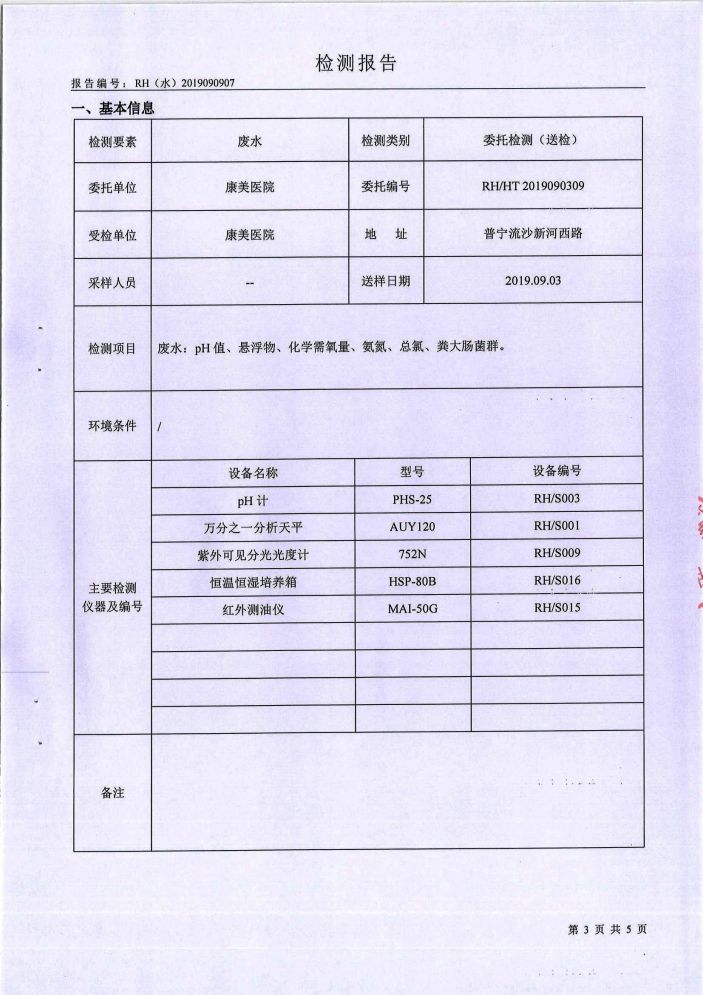 康美醫院2019年第三季度廢水檢測報告
