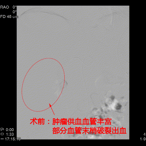5月11日下午,内三科主任李旭丹、影像科副主任胡志華上台施術。通過粵東領先的飛利浦DSA造影顯示,患者腫瘤供血血管豐富,膽囊動脈造影可見腫瘤染色明顯,有造影劑外溢,提示部分血管末梢有破裂出血現象,探查胃十二指腸動脈及腸系膜上動脈未見出血征像,豐富的血供使腫瘤能獲取大量的營養快速生長,血管末梢的破裂出血導緻患者反複黑便。